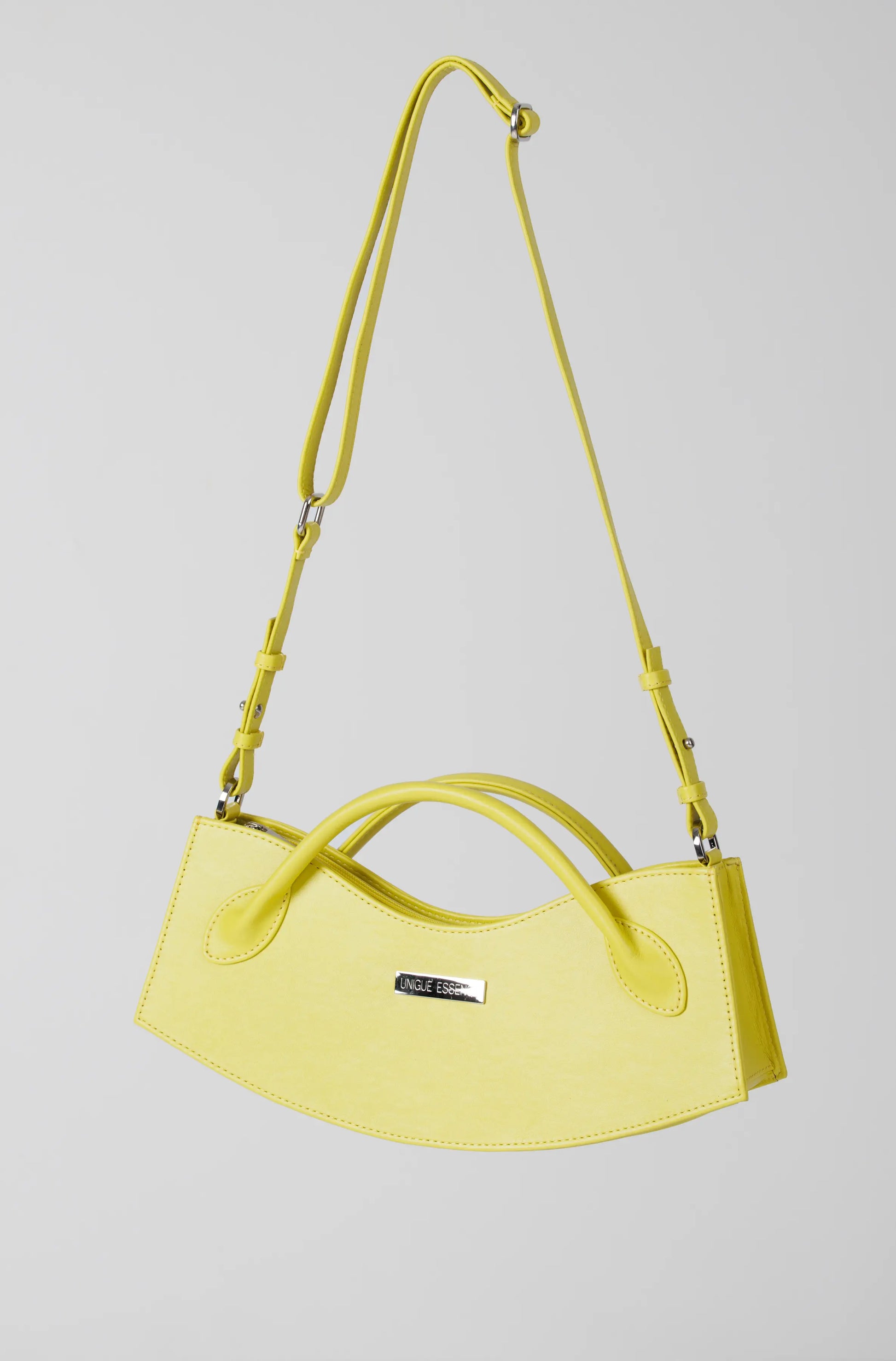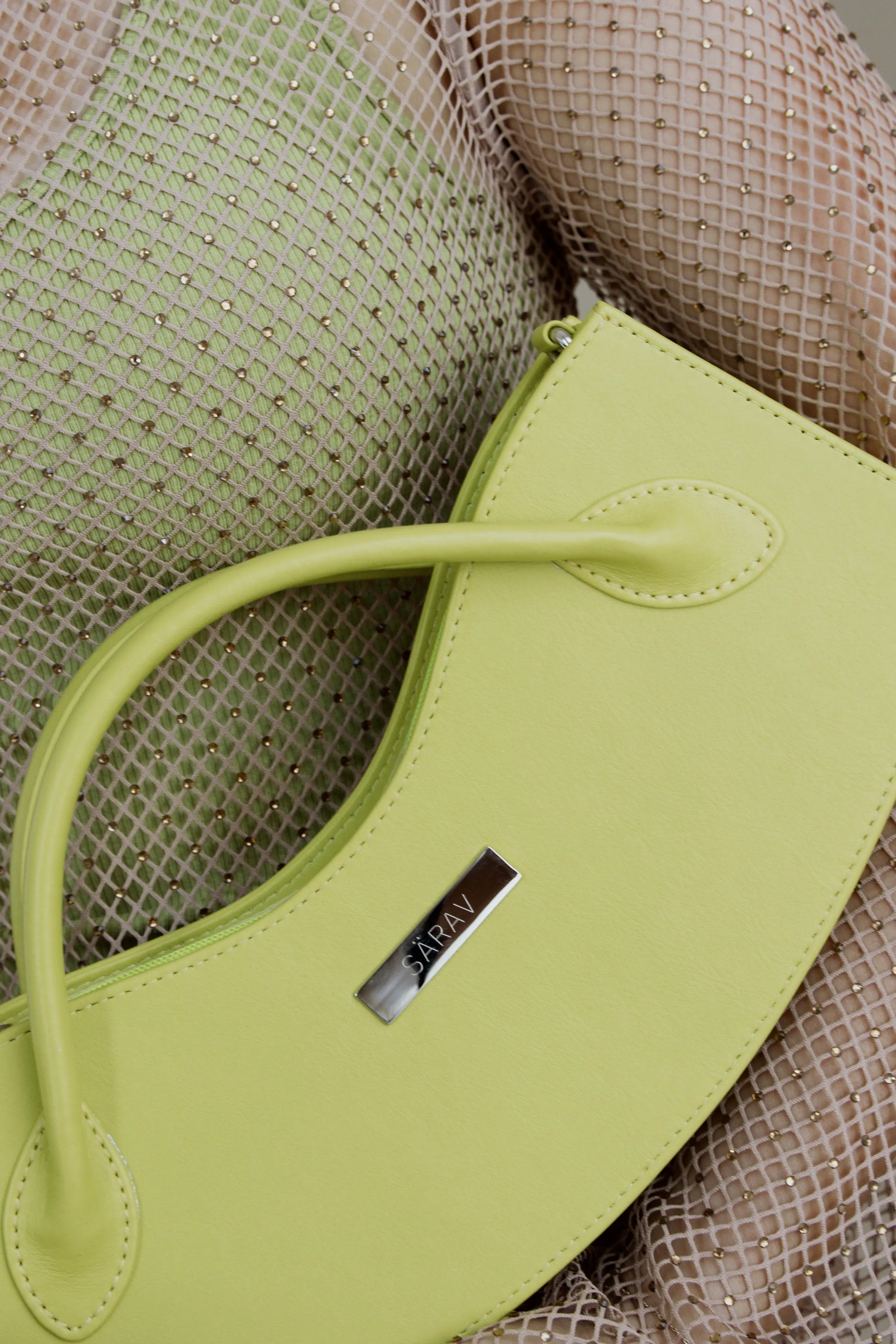 Laimikollane käekott graveeritud sildiga „Särav.“ Kott on voodriga ja kohandatava rihmaga. Kotil on lukuga voodritasku.