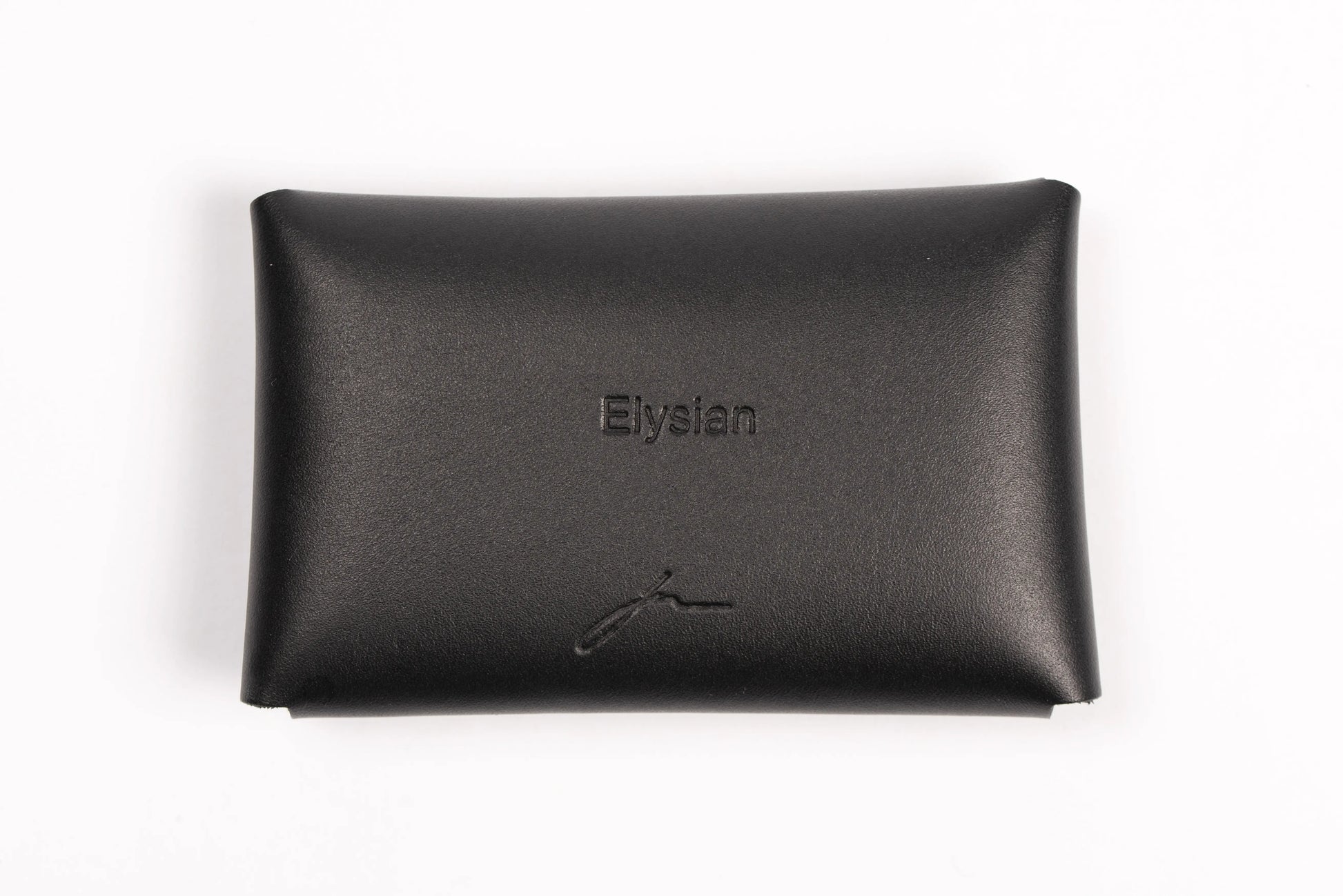 Must nahast kaarditasku/rahakott pressitud sildiga „Elysian.“ Mahutab hulgaliselt kaarte ja hoiab ka münte.