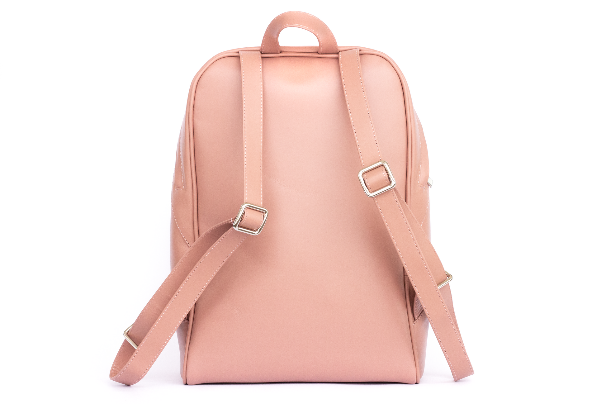 - Vanaroosa nahast seljakott graveeritud sildiga „Rõõmu täis.“ Kott on voodriga ja kohandatavate rihmadega. Kotil on üks lukuga voodritasku. Unikaalse lõikega, vormi hoidev kott on ajatu disainiga.