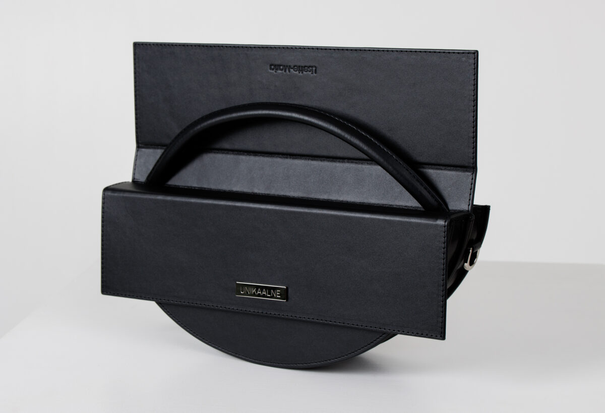 Täisnahast, kahe taskuga ja õlarihmaga käekott, millel graveeritud silt “Unikaalne”.